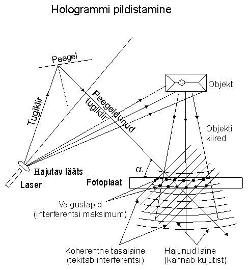 Siin peitub hologrammi pildistamise idee: esemelt hajunud valgus tuleb kokku juhtida laserist otse tuleva valgusega, nn tugikiirega. Lainete kohtumispiirkonnas tekib seisev valguslaine -- osas ruumipunktides on valgus intensiivsem, osas punktides nõrgem. Kus need punktid asuvad, sõltub ainuüksi hajunud lainest (laserivalgus on kogu aeg ühesugune). Seega kannab seisulaine täielikku infot esemelt tuleva valguse kohta. Sellesama valguse, mis meie silma sattudes tekitab kujutise vaadeldavast esemest.