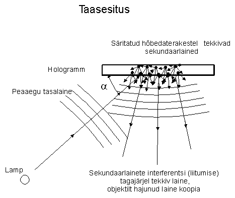 Miks? Tugivalgus hajub nendes samades punktides, kuhu on koondunud emulsiooni jäänud hõbeda aatomid, st seal, kus seisevlaine intensiivsus oli suurem. Tekib tohutu hulk punktikujulisi valgusallikaid, mis kõik kiirgavad laineid. Nagu ütleb laineoptika alus -- Huygens-Fresnel'i printsiip, kujuneb nende lainete liitumise -- interferentsi -- käigus uus valguslaine. Et hõbedaterad-valgusallikad paiknevad vastavalt pildistatavale lainele, taastub endine valguslaine.