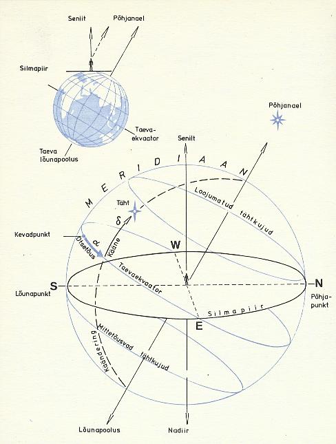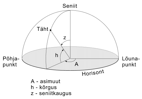 TaevakoordinaadidMe peame iga päev kindlaks tegema millegi asukohta või suunda nii Maa peal kui ka taevas. Selle lihtsaks näiteks on ilmakaared. Astronoomias ei piisa lihtsalt ilmakaarte kasutamisest. Selleks, et uurida taevakehade liikumist või näiteks määrata kindlaks astronoomilist aega, on vaja väga täpselt mõõta taevakehade asendit taevasfääril. On loomulik, et selleks kasutatakse eelkõige sfäärilisi koordinaate. Täheteaduses on kasutusel mitu taevakoordinaatide süsteemi. Maa liikumisest rääkides viitasime, et Maa võtab osa mitmest liikumisest üheaegselt. Erinevad koordinaadid ongi seotud sellega, millise liikumise me aluseks võtame ehk teisiti öeldes, millise taustsüsteemiga on vaatleja seotud. Horisondilised taevakoordinaadidon seotud vaatleja asukohaga Maa peal ehk horisondi ja seniidiga vaatleja kohas. Horisondilisteks koordinaatideks on asimuut ja kõrgus. Taevakeha asimuut on nurk meridiaantasandi ja taevakeha läbiva vertikaaltasandi vahel ning seda loetakse lõunapunktist alates lääne poole 0 kuni 360 kraadini (mõnikord ka põhjapunktist ida poole nagu geograafilise asimuudi puhul). Kõrgus on nurk taevakeha suuna ja horisondi vahel, mida mõõdetakse mööda vertikaali ehk kõrgusringi kaart. Seda mõõdetakse alates horisondist põhja poole 0 kuni 90 kraadini ja lõuna poole 0 kuni -90 kraadini. Tihti kasutatakse kõrguse asemel seniitkaugust. Taevakeha kõrguse ja seniitkauguse summa on 90 kraadi.