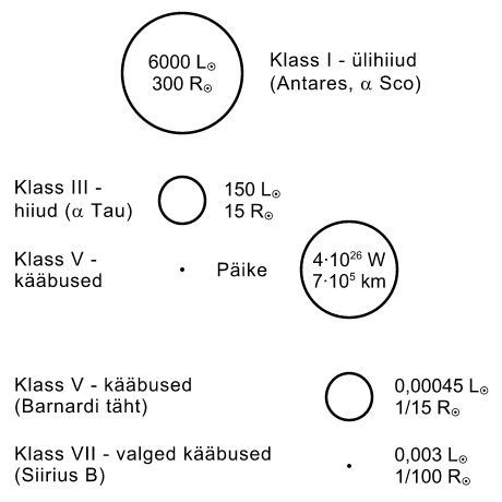 Joonis 1. Suured ja väikesed tähed. Võrdluseks Päike.