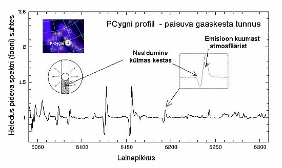 Joonis 3. Kui tähte ümbritseb paisuv gaaskest, tekib S-kujulise profiiliga joon. Selle põhiosa paistab emisioonijoonena, neeldumiskomponent on Doppleri efekti mõjul nihkunud vasakule (meile lähenev kest tekitab "sininihke").
