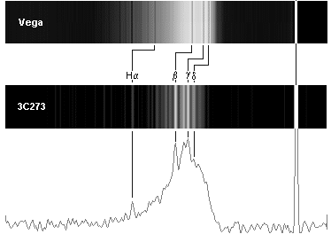 Joonis 2. Emisioonijooned: Kui tavalises spektris (Vega) on vesiniku jooned foonist tumedamad, siis kvasari (3C273) spektris paistavad nad heledatena.