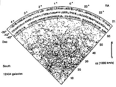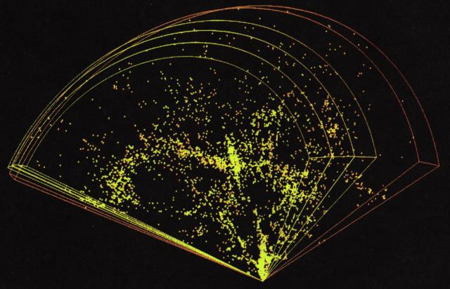 Joonis 1. Galaktikate ruumjaotus kaugustel kuni 500 miljonit valgusaastat. Näha on ulatuslikud tühikud, kus galaktikaid kaunis hõredalt. Radiaalsed kiired -- nn. Jumala Sõrmed -- ei kajasta galaktikate tegelikku asukohta, vaid vastavad galaktikaparvedele, kus sisemised liikumised segunevad Hubble'i seadusest tuleneva "laialilendamisega". (V. de Lapparent, M. Geller ja J. Huchra, 1986.)