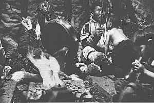 Demnime Kosterkin is shamanising in his tent near Ust-Avam village. His son Dulsymyaku is assisting him. Photo (65K) by A. Lintrop 1977. Participating in father's séances gave Dulsymyaku many experiences in singing shaman songs, drumming, divination etc.