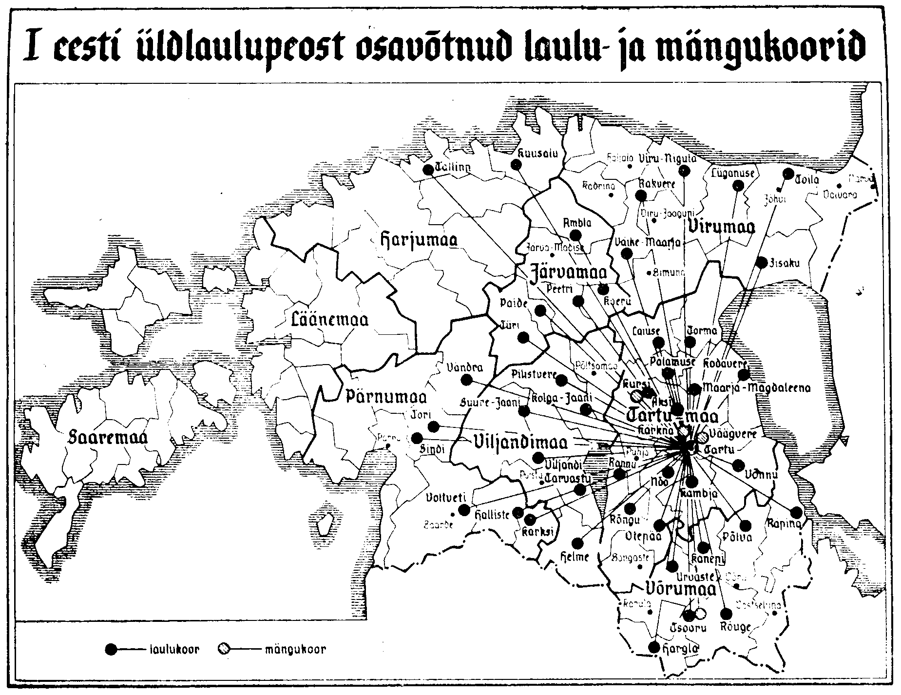 Eesti rahva ajaloos nii kaalukat osa etendanud laulupeo-fenomen kujutab endast kultuurilaenu, millest formeeriti rahvusliku eneseteadvuse kasvatamise tähelepanuväärne tegur, sellest kujundati rahvuslikku identiteeti kandev traditsioon. Saksa kultuuriareaalis harrastatavate suurte laulmispidustuste eeskujul arenes ka baltisaksa Liedertafel lauluseltside avatud ühistegevuse vormiks laulupidude korraldamine, esimene neist toimus 1836. aastal Riias. Oluliseks tõukejõuks koorilaulu energiliseks maarahva hulgas propageerimiseks sai 1857 Tallinnas peetud baltisaksa laulupidu. Oma ajalehes "Perno Postimees" seda sündmust lugejaile tutvustades kiitis Johann Voldemar Jannsen, et Saksamaal on igas külas lauluseltsid (Leichter 1991, 87). Jannsen võttis esimesena kasutusele sõnakombinatsiooni "eestirahvas" senini käibinud "maarahva" või "talurahva" asemel, ning järgneva kümnendi jooksul sai see sõnapaar üldisemalt tuntuks. Mitme koori koosesinemised toimusid laulupüha nime all küll juba 1855 ja 1857 Põlvas, kuid laiema kõlapinnaga esimese kihelkondliku laulupüha kutsus 1863. a. Ansekülas kokku kohalik pastor Martin Körber, sel peol osales 500 lauljat. Põhja-Eestis (ehk täpsemalt tolleaegse administratiivse jaotuse järgi Eestimaa kubermangus) peeti esimene eesti laulupüha kaks aastat hiljem Jõhvis ning juunis 1869 toimus Tartus peale kaheaastast võimudelt loa taotlemist esimene üle-maaline eestlaste laulupidu. Peol astus üles 51 koori ja puhkpilliorkestrit, milles oli ühtekokku 845 esinejat ja publiku hulgaks tuli kahe peopäeva peale kokku 15 000 kuulajat! * vt.Kaart1 Ühtlasi seati nüüd silme ette siht rahvuslikust edenemisest, rahvuslikust ühtsusest ja kultuurilisest enesemääramisest. Siit sai alguse ka müüt, mis meie päevil võttis uut tuult tiibadesse nn. laulva revolutsiooni käigus - müüt sellest, et rahvas võib end vabaks laulda, ja seda ka poliitiliselt. On isegi väidetud, et eestlased laulsid ennast rahvaks. Pärimuslike ja laenatud kultuurielementide põimumise tulemusena loodi rahvusliku kultuurimudeli uus versioon (Dégh 1978, 43).